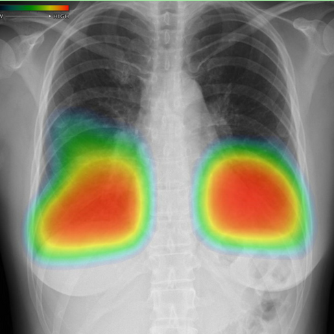 最近の特徴的な画像(右側は、AIによる胸部レントゲンの画像評価結果です。非常に優秀です)を共有します。